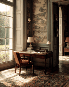 My Writing Room sits in the east wing of an imagined house, where morning light falls across maps, books, and the stories taking shape. Just beyond it, wide French doors open into a garden of ideas, reflections, and conversations about the deeper questions behind the work.